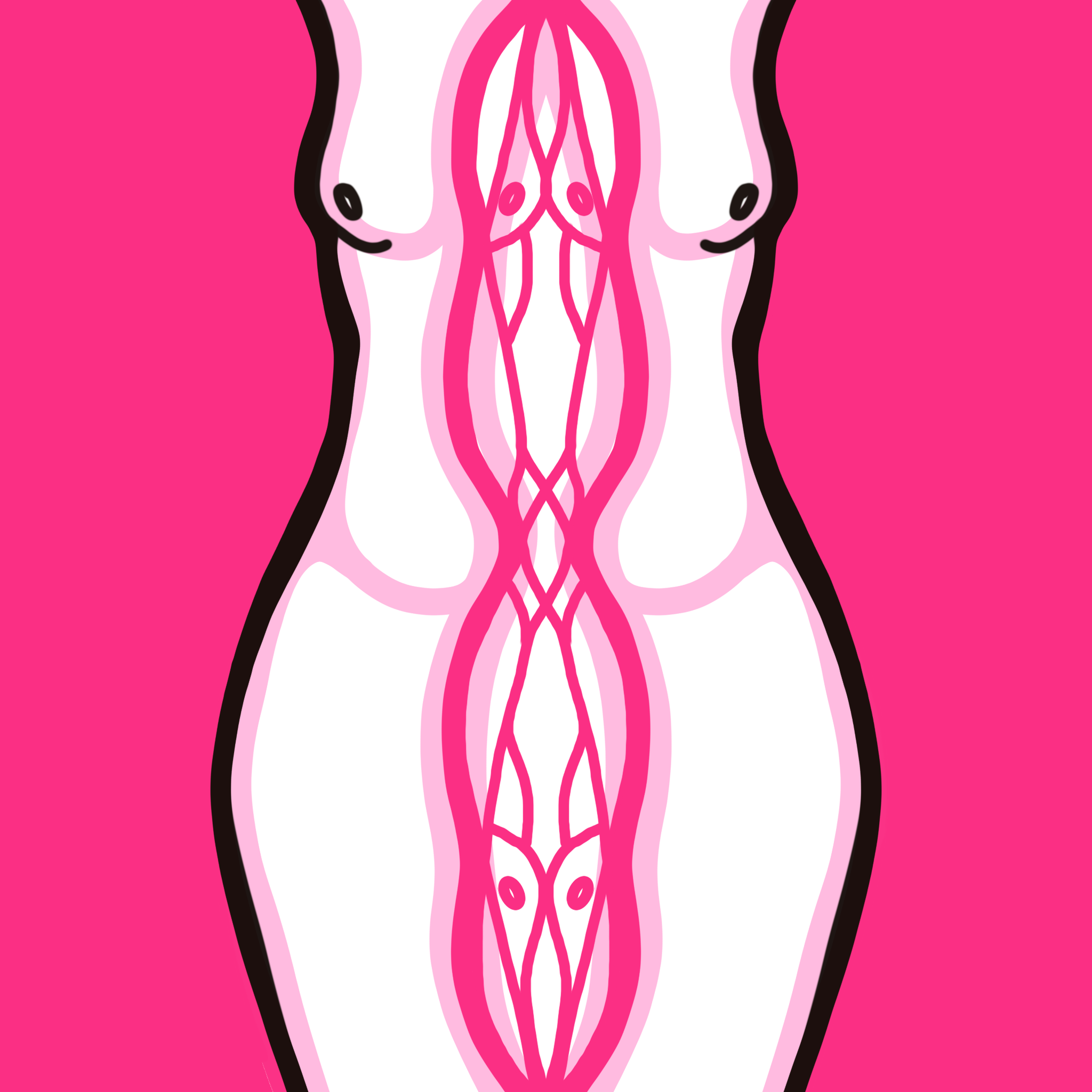 The repetition and overlay create a sense of multiplicity within a single body — as though many forms exist within one. The soft tonal layering of pinks builds depth, while the saturated outer background amplifies presence and confrontation.